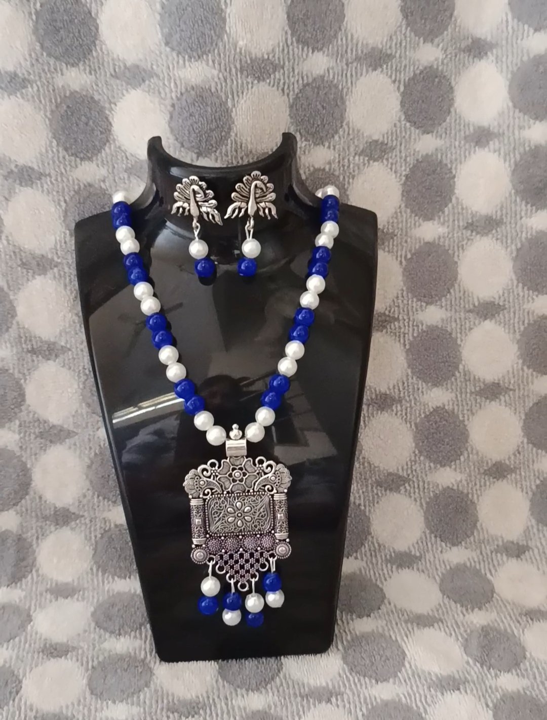 Blue white beads and oxcidsed silver pendant necklace set