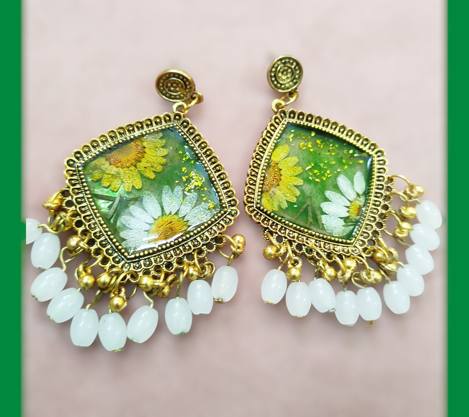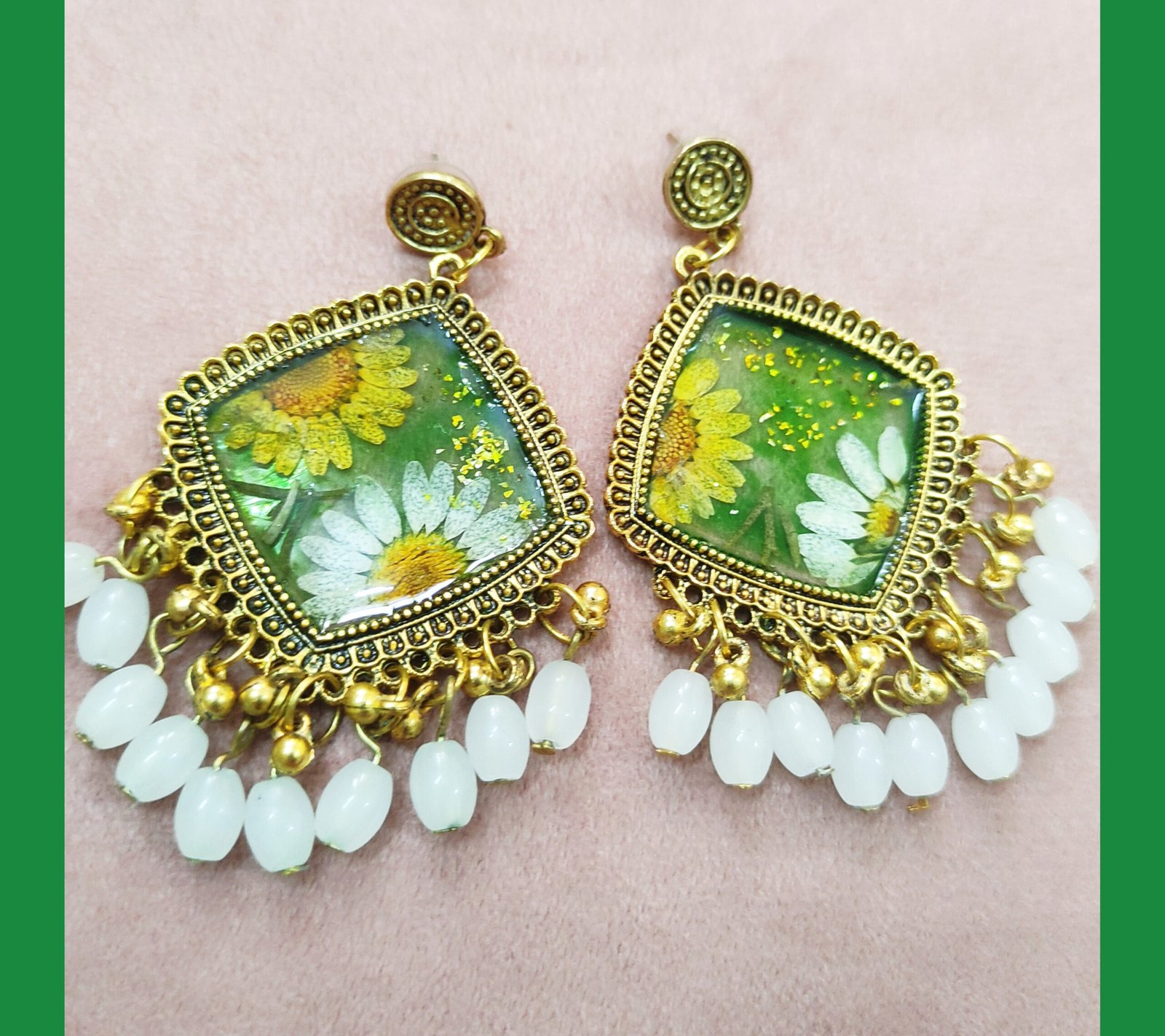 Ingredients- preserved flowers(daisies, sunflowers),white beads, gold-tone metal alloy.