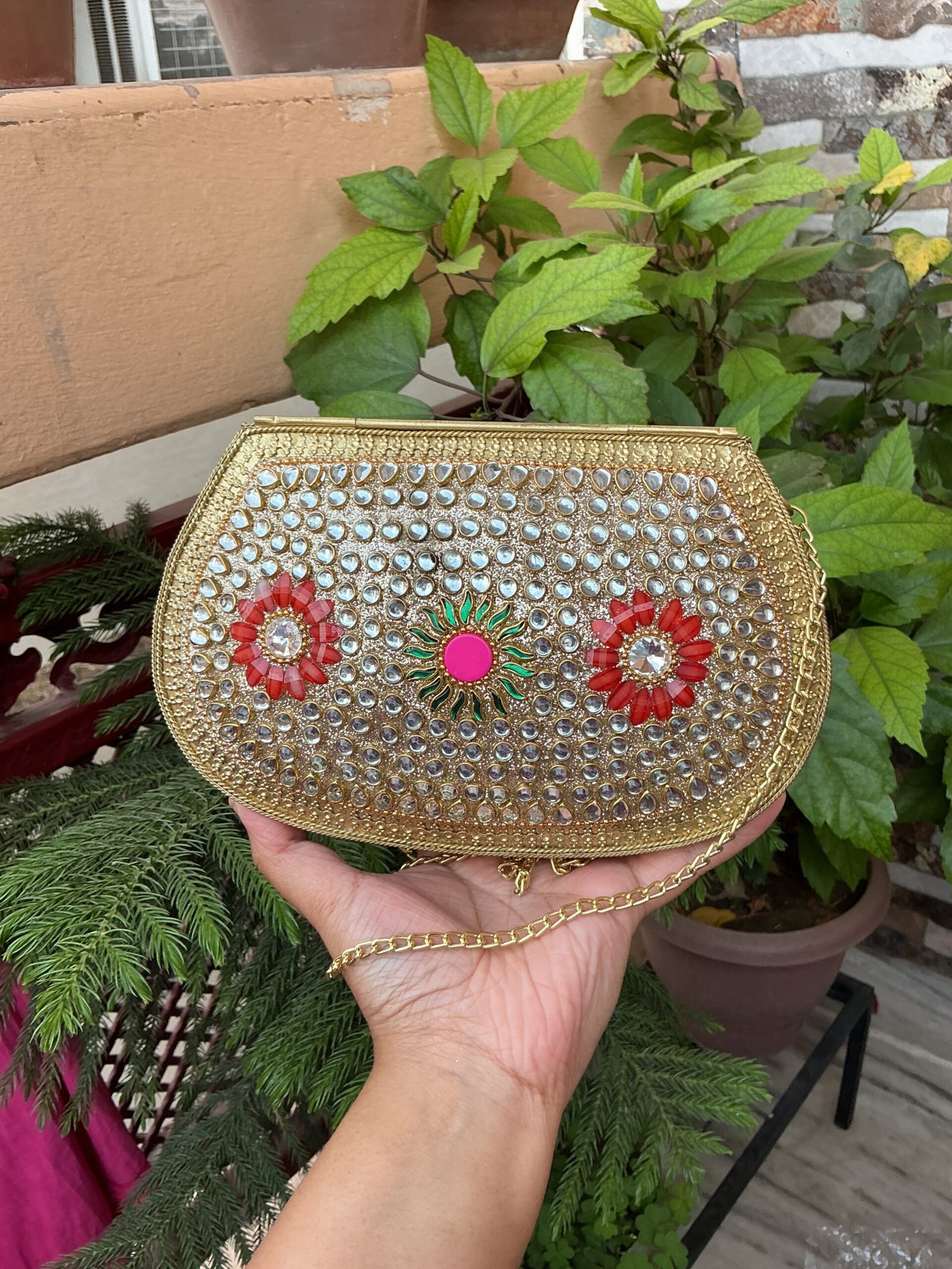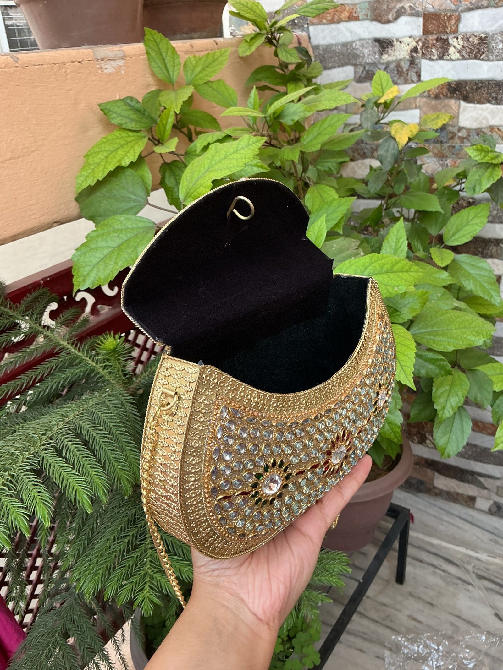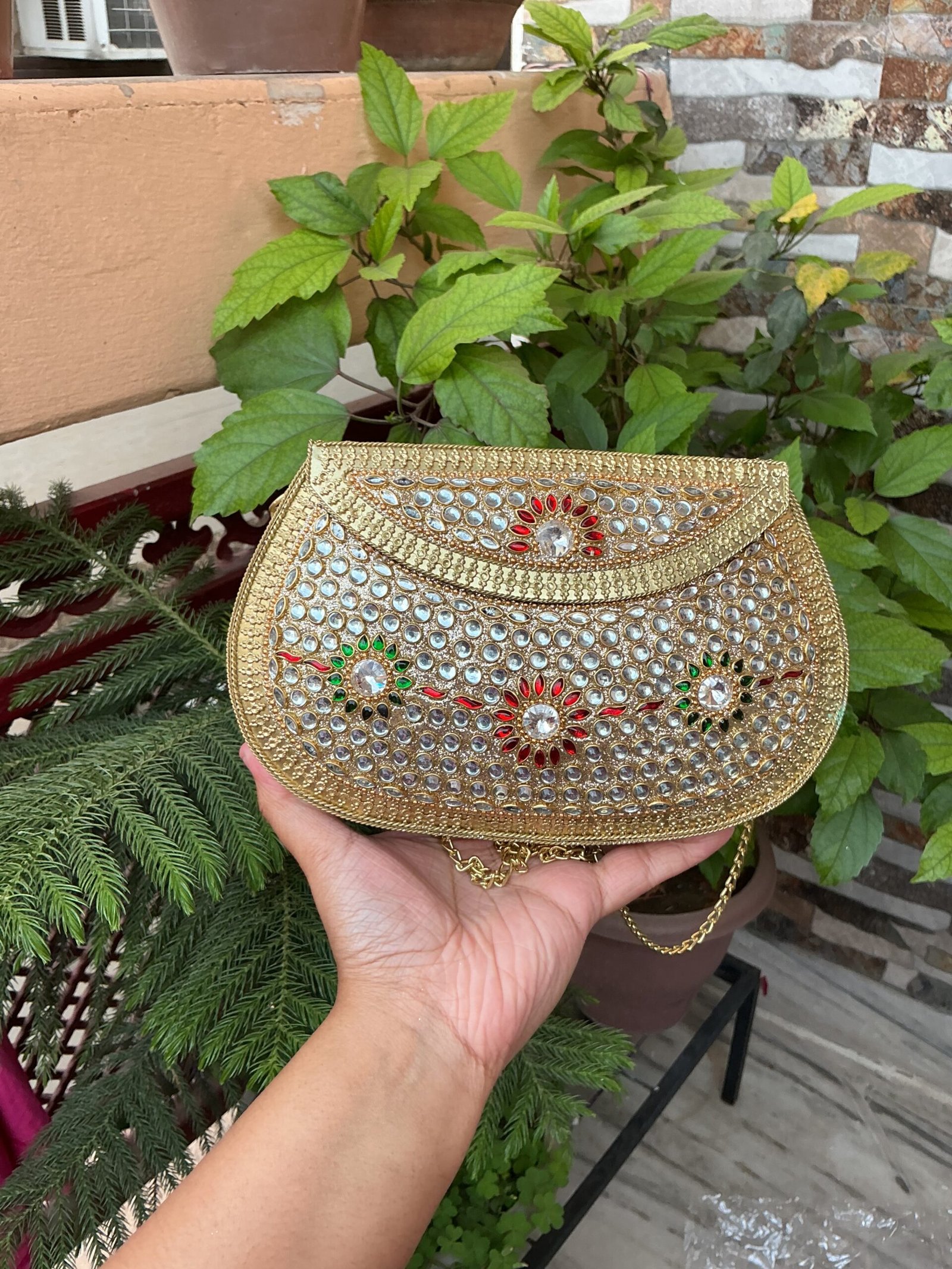 This elegant gold clutch features intricate Kundan work and traditional embellishments that radiate festive charm. Adorned with teardrop and floral patterns in red and green stones, it beautifully blends classic craftsmanship with a royal aesthetic. The detailed metallic embroidery and shimmering accents make it a perfect accessory for weddings, parties, and cultural celebrations. Compact yet eye-catching, this clutch adds a luxurious touch to any ethnic outfit.