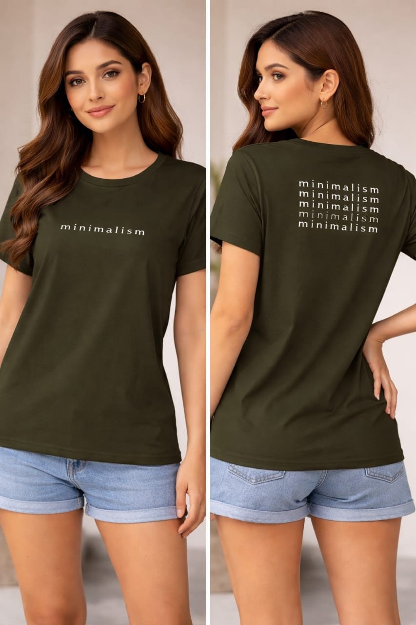 Keep your style simple yet impactful with this trendy minimalism t-shirt in a rich olive green shade. Featuring a clean “minimalism” print on the front and a bold repeated typography design on the back, this tee is perfect for those who love understated fashion with a modern edge.