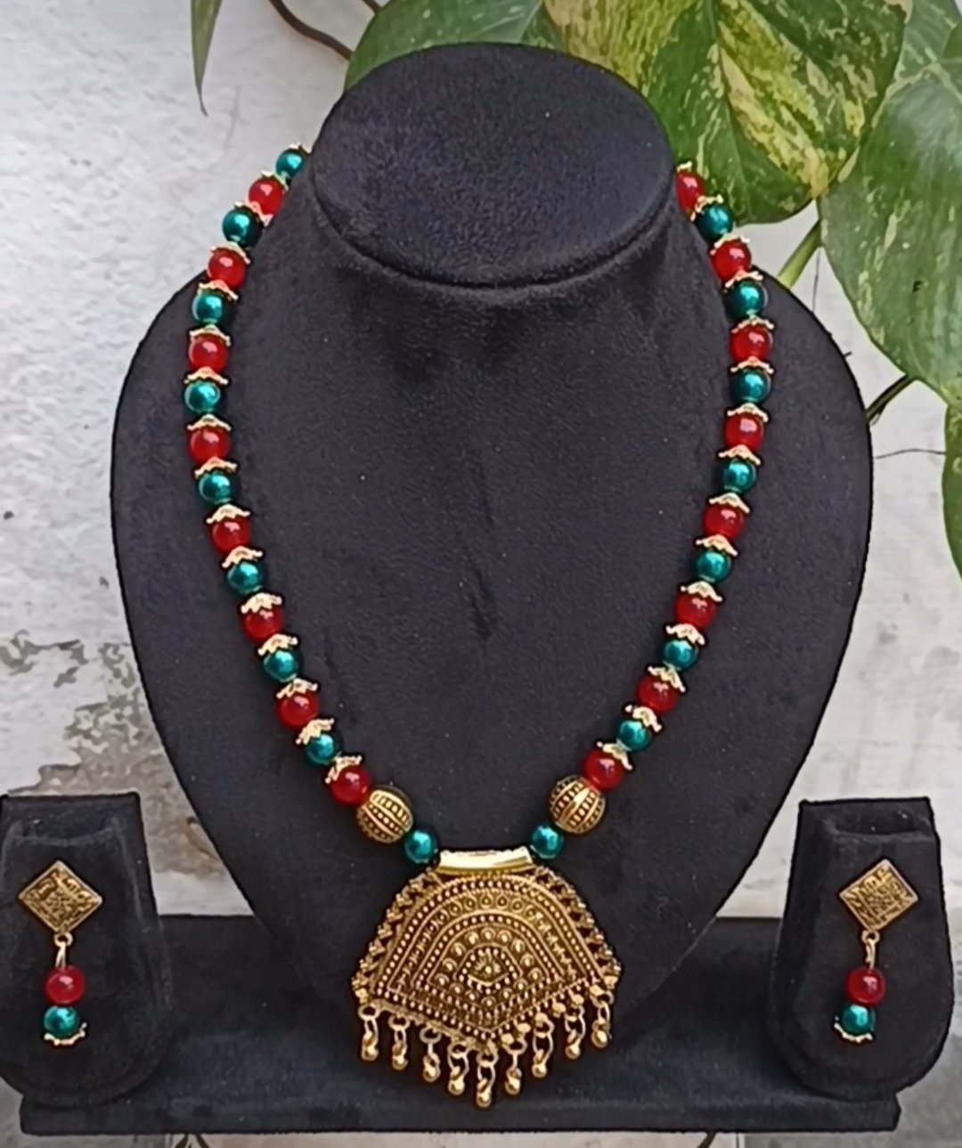 Red green beads and golden beads and golden pandnet necklace set