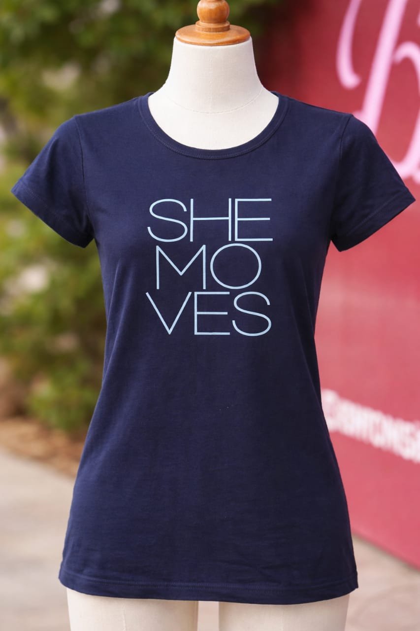 • Design: Minimalist “SHE MOVES” stacked text in a light blue, thin-line font.